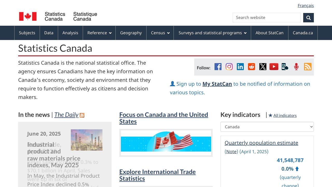 Economic, social and census data with daily analysis of statistical releases from Statistics Canada. Hundreds of free electronic publications to view and download.