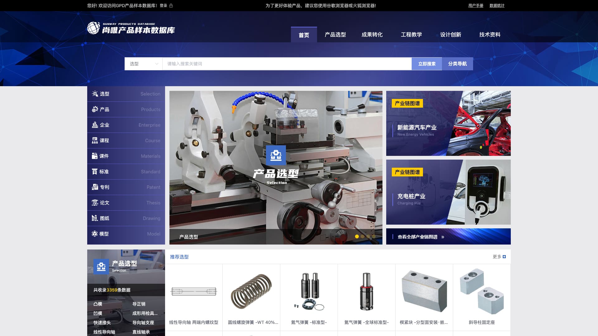 It collects product sample data of enterprises in the global industrial production and manufacturing field, including resources such as enterprises, products, selection, courses, courseware, drawings, models, standards, patents, and papers. It can realize functions such as product selection, quick search, advanced search, product sample display, enterprise search and display, courseware viewing, drawing and model viewing, category navigation, data statistics, industrial chain map, and resource download.