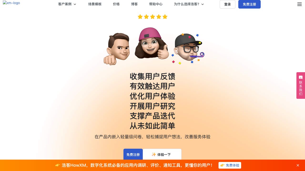 浩客HowXM,数字化系统的应用内调研、评价、通知工具,简单好用的用户体验分析工具,在WEB/APP/小程序中快速嵌入问卷、评价、通知,获取用户的反馈和评价,提升用户体验,精准触达激活用户。产品经理、UED、市场必备的体验分析工具。应用场景包括:反馈评价收集、NPS调研,满意度调研、A/B版本测试、付费流失调研、新功能引导、促销通知等等。