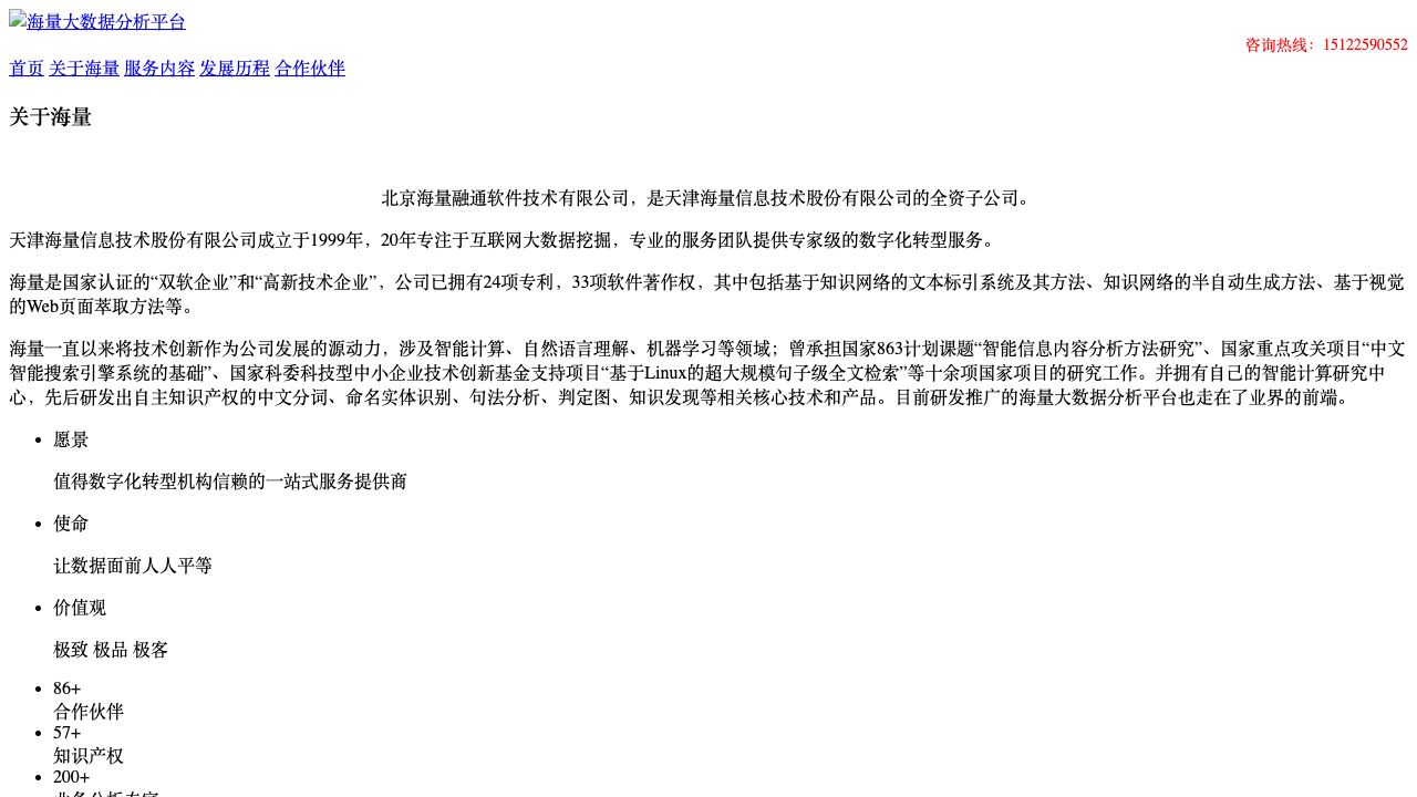 海量大数据分析平台——大数据综合型一站式服务平台,其服务品类涵盖数据对接、数据清洗、语义分析、数据挖掘、舆情监控、风险预警、用户画像、精准营销、竞品监测、数字大屏等,覆盖大数据、人工智能、AI等高端技术领域,是基于海量20年大数据专业技术积累的服务平台。海量平台,一站式解决企业大数据需求的300种难题。