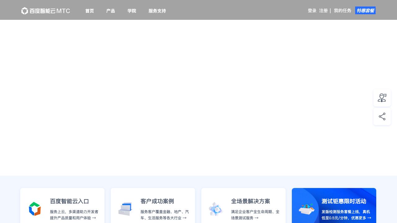 百度移动云测试中心简称MTC(Mobile Testing Center),是业界领先的移动应用一站式测试服务平台,为广大企业、开发者提供覆盖产品全生命周期的测试服务,包括兼容性测试、功能测试、远程真机调试、安全测试、海量用户体验测试等核心测试服务,解决企业在移动应用测试过程中面临的成本、技术和效率问题。