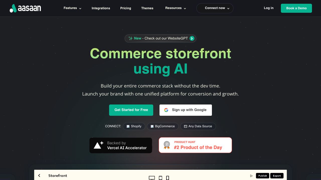 Connect Aasaan to your existing data sources like Shopify or BigCommerce using its headless APIs. Then, use the AI-powered website builder to customize your storefront with no code. Deploy seamlessly and manage your store from a centralized dashboard or the owner app.