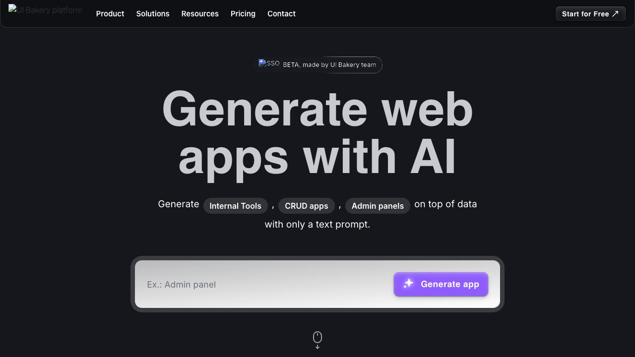 UI Bakery is a low-code platform that allows users to generate web apps from data using AI prompts and visual editing. It offers features like drag-and-drop UI building, workflow automation, embedded applications, and database hosting.