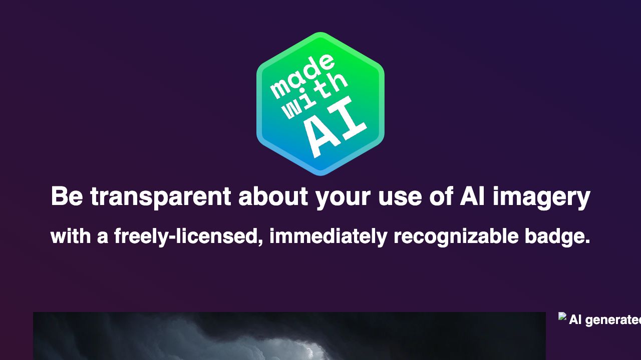 The website provides a freely-licensed, immediately recognizable badge to indicate the use of AI imagery. It aims to promote transparency in AI-generated content, offering a universal mark for creators who wish to disclose that an image was generated by AI.