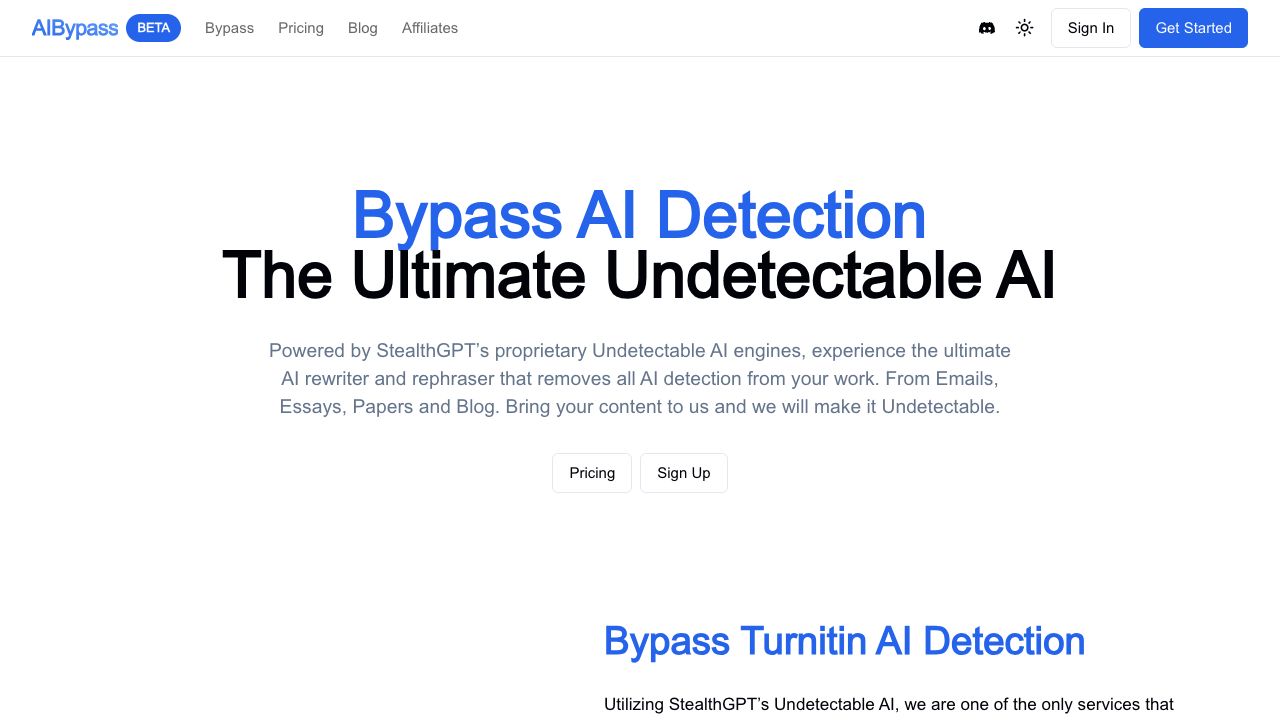 AI Bypass is an AI bypass tool powered by StealthGPT, designed to bypass AI detection in text. It helps users generate undetectable AI text, remove AI detection, and bypass Turnitin. It rewrites and rephrases content to avoid detection by AI detectors like Turnitin, GPTZero, Originality, and Copyleaks.