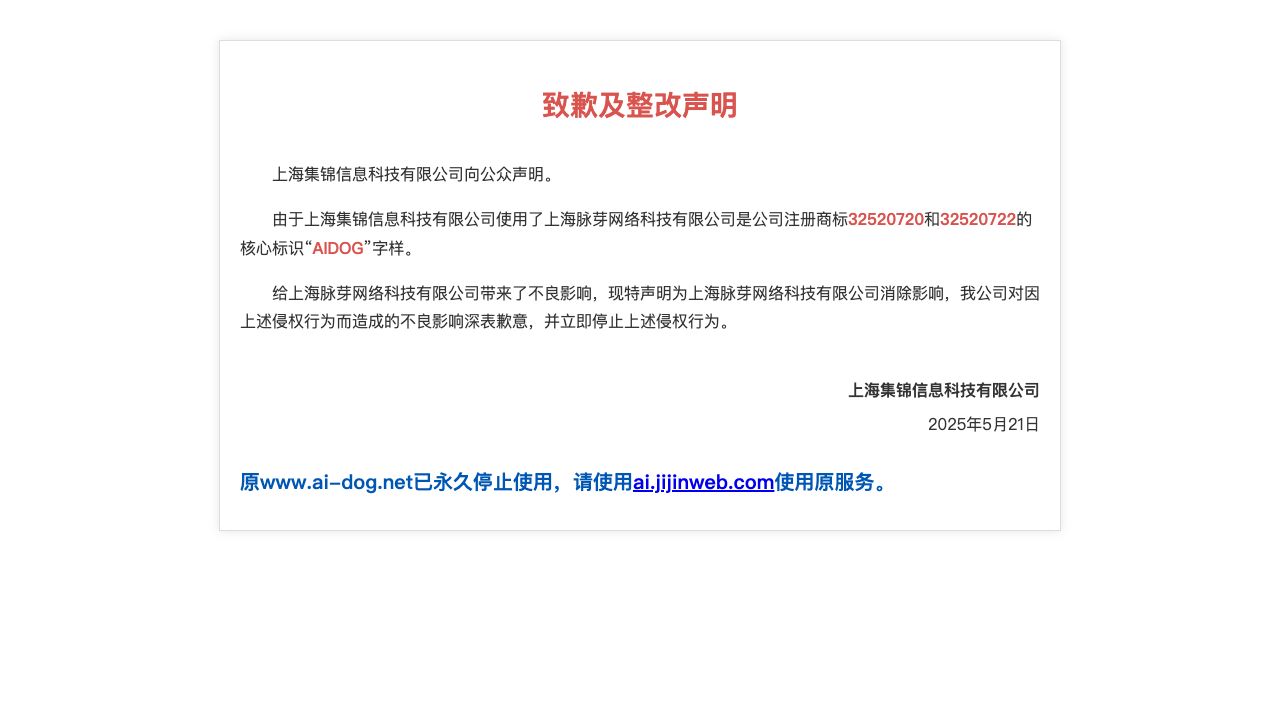 AI-DOG is a platform developed by Shanghai Jijin Information Technology Co., Ltd. that focuses on AI content creation. It aims to revolutionize content creation efficiency through AI, enhancing both the efficiency and quality of user-generated content. The platform offers features such as AI-powered logo creation, article writing, company name generation, and copywriting, along with solutions for website optimization, intelligent Q&A, marketing copywriting, video copywriting, literary creation, and overseas copywriting.