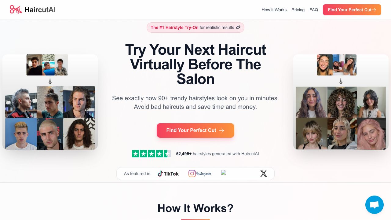 HaircutAI is an AI-powered hairstyle generator that allows users to virtually try on different hairstyles before visiting a salon. By uploading photos, the AI analyzes facial features and generates realistic transformations, enabling users to preview over 90 haircuts and hair colors. This helps avoid bad haircuts, saves time and money, and allows users to explore various styles risk-free.