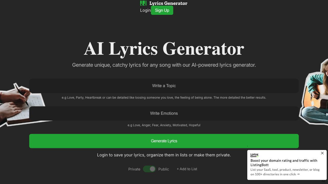 LyricsGenerator.com is an AI-powered tool designed to help users generate unique, catchy, and meaningful lyrics for songs. It requires no writing skills and offers features like rhyme suggestions, syllable counting, and metaphor generation. It also provides various genre-specific lyric generators.