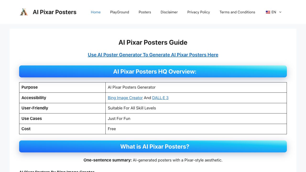AI Pixar Posters is a guide and a collection of tools that allow users to generate Pixar-style posters using AI. It leverages platforms like Bing Image Creator and DALL·E 3 to create these posters from text prompts. The website provides information on how to use these tools and offers examples and tips for creating effective prompts.