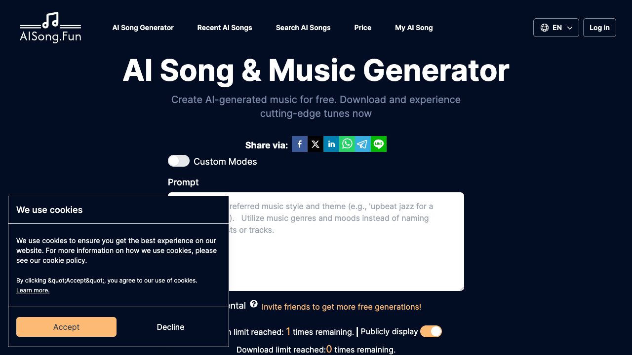 To start creating music, log in to your AISong.Fun account, choose a prompt or instrumental, and generate your song. Custom Modes allow you to input your own lyrics, song style, and song name for personalized music.