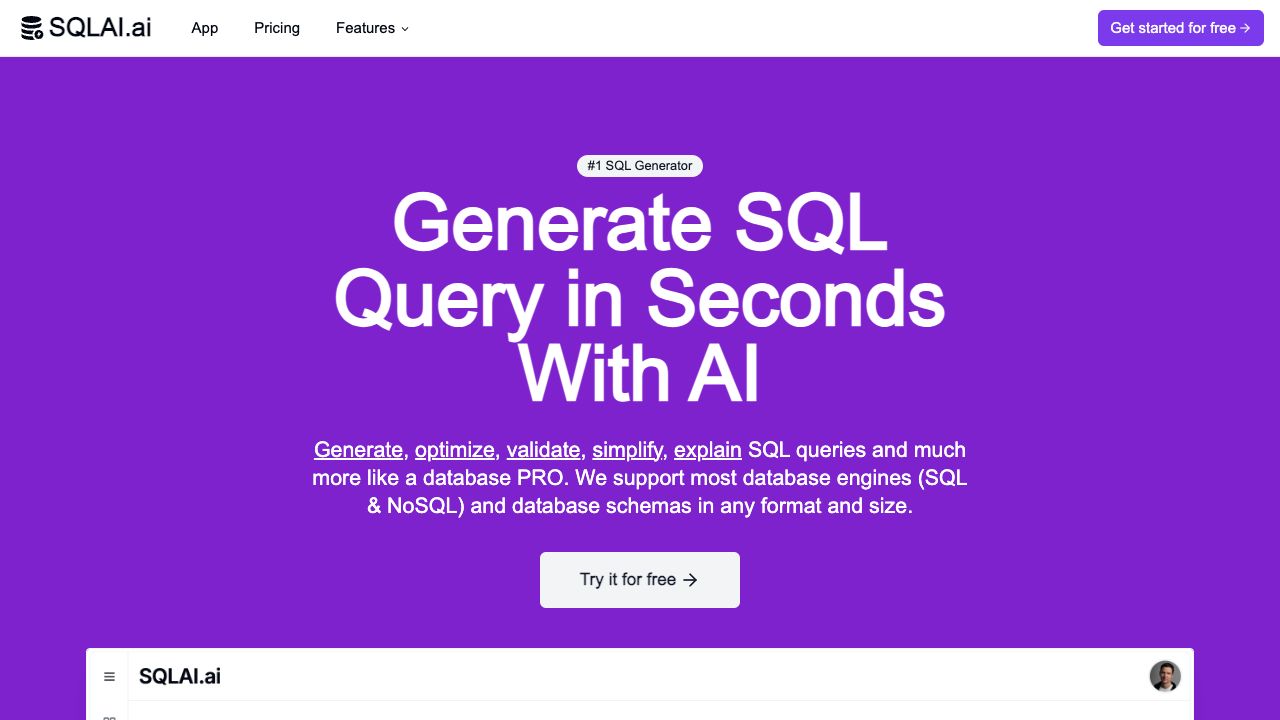 SQLAI.ai is an affordable, easy-to-use SQL multi-tool designed for both SQL beginners and professionals. It offers AI-powered generators to produce precise SQL or NoSQL queries, optimize, fix, simplify, explain, format, and convert SQL queries, and generate database indexes. It supports most database engines (SQL & NoSQL) and database schemas in any format and size. SQLAI.ai also allows users to connect to data sources to increase accuracy and get tailored data insights.