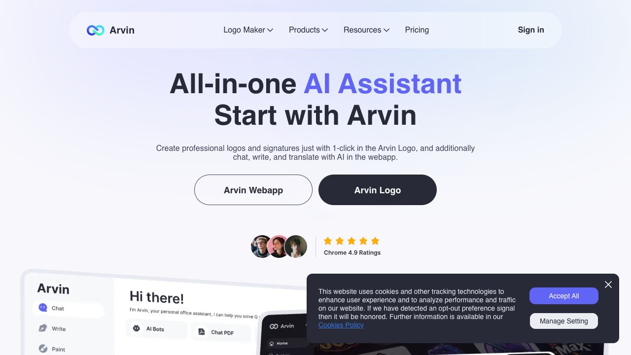 Add the Arvin AI Chrome extension for AI summary and web translation. Use Alt/Option + A to open Arvin. Access AI chat, writing, and logo design tools via the web app. Generate logos and signatures with one click.