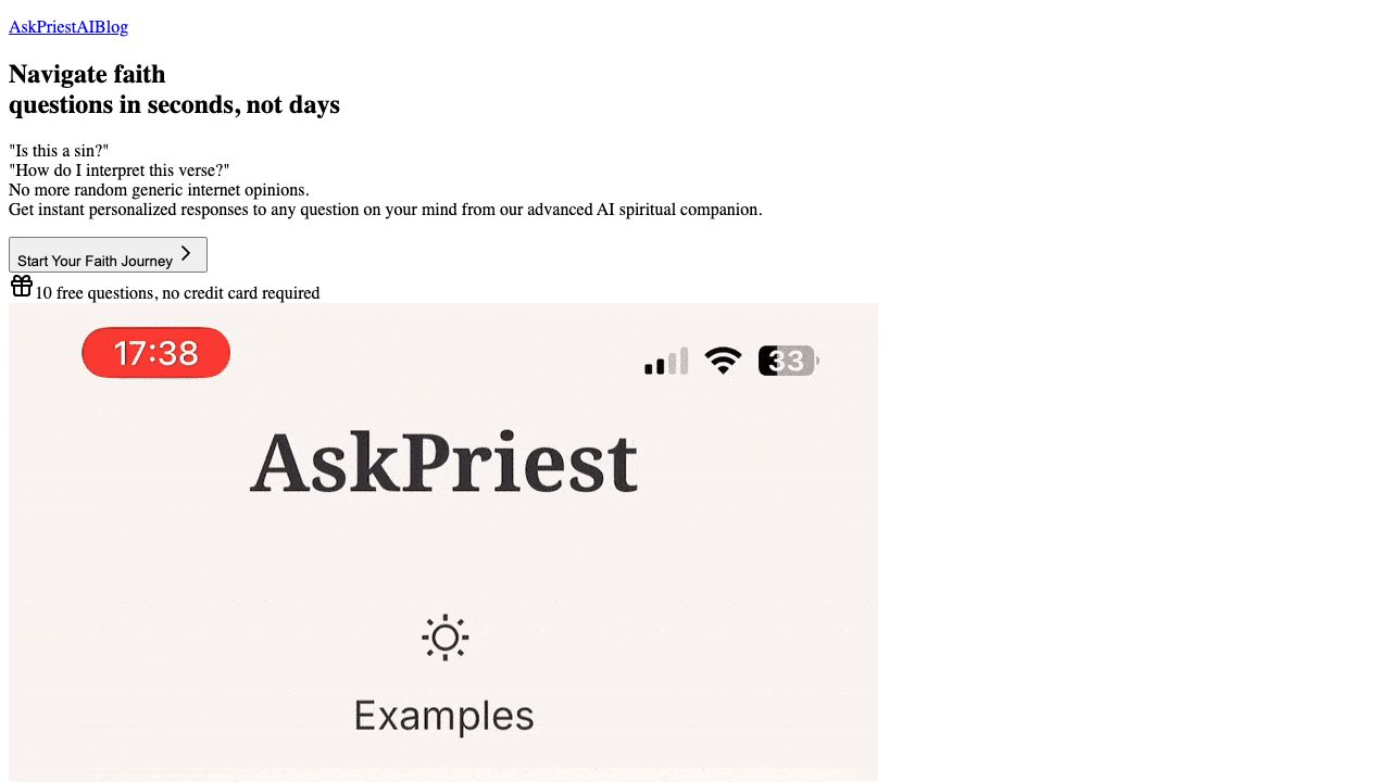 AskPriestAI is a virtual Christian guide that provides instant Christian guidance and spiritual advice 24/7. It allows users to have full conversations, upload pictures, and soon send voice messages. It offers personalized responses to faith questions rooted in scripture.