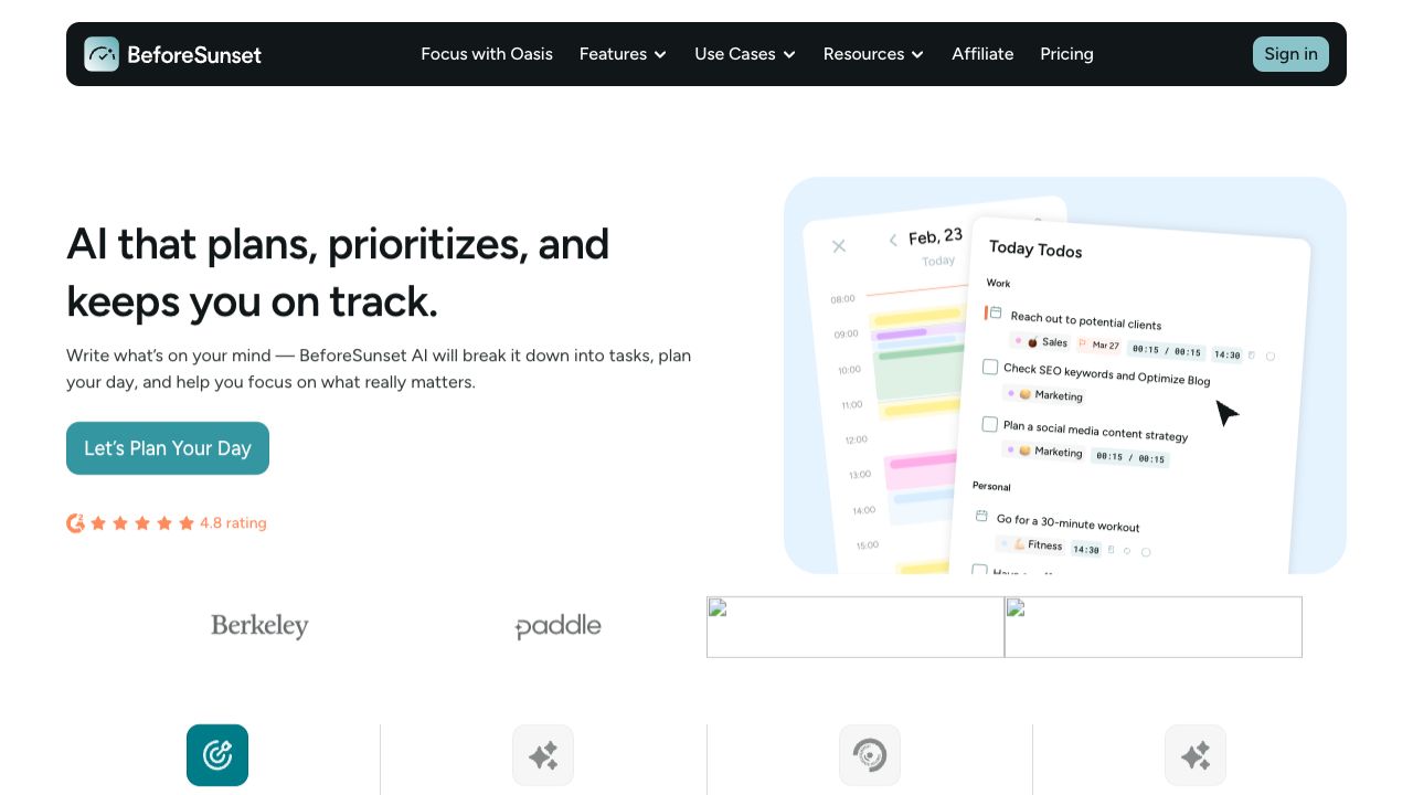 BeforeSunset is an AI daily planner tool for busy professionals that plans your day based on your schedule and to-do list. Or, you can create a plan yourself by syncing your calendar. It provides analytics to get insights for sunsetting the day stress-free.