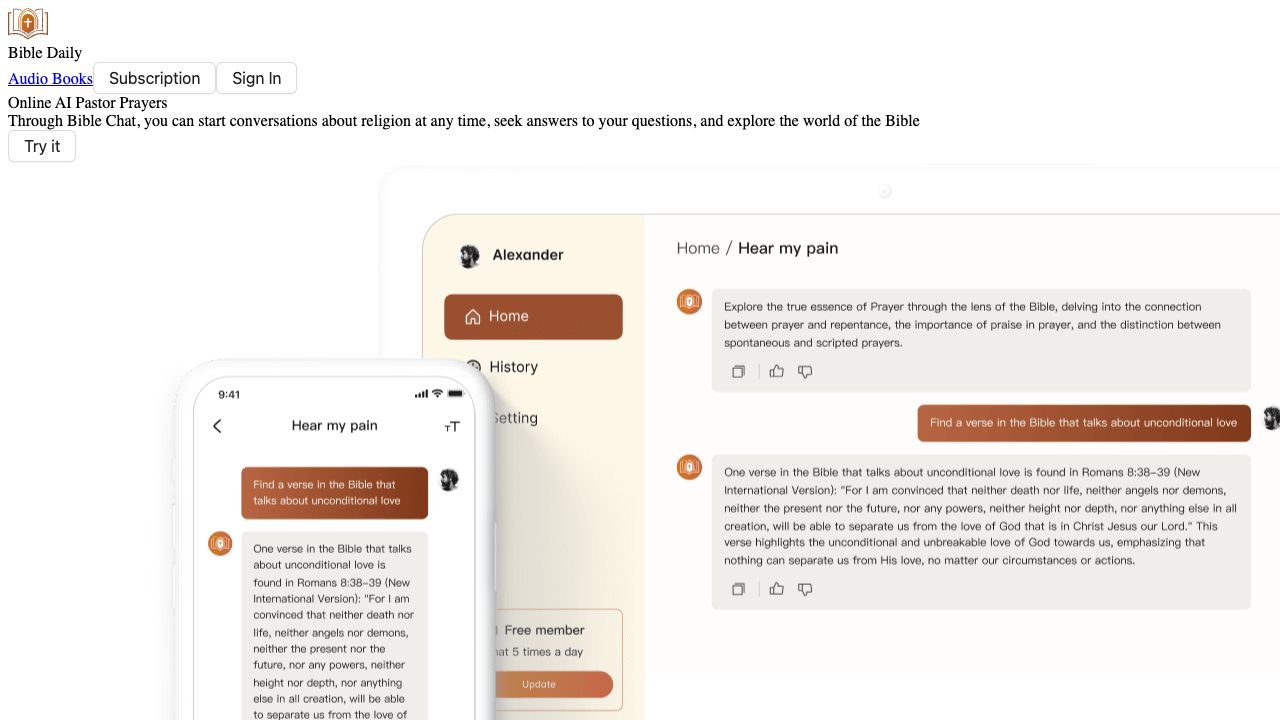 AI Pastor is a website that offers AI-driven spiritual guidance and Bible exploration. Users can share their troubles with the AI pastor anytime, create personalized devotionals and Bible studies, ask questions about Bible verses and themes, and explore topics like mental health, forgiveness, creation, and faith.