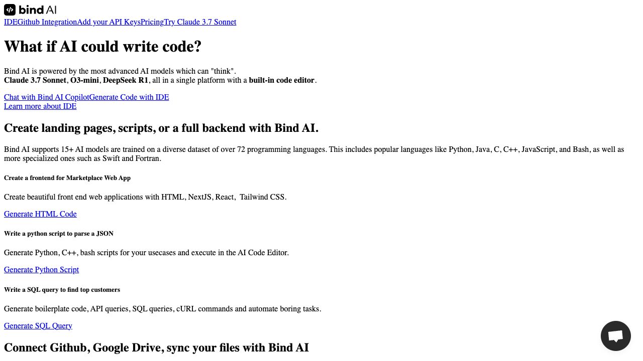 Bind allows you to connect your salesforce, intercom, internal databases, and create conversational AI Assistants to provide insights and answers on your customer data. Bind AI is an advanced copilot and AI Assistant for code generation, web search, writing technical content and much more. It is an alternative to ChatGPT, Claude AI with an in-built editor canvas, and automation which connects with your data sources and applications. It natively integrates Github with Claude AI models and enables engineering and non-tech teams to sync GitHub repositories for Code Generation and getting insights on your codebase.