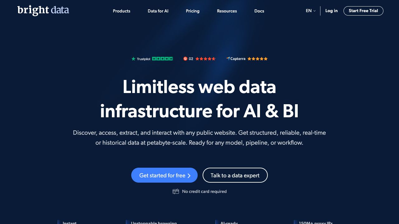 Bright Data offers various methods: use proxy infrastructure for customization, enable scraping automation for unblocking and website interaction, or access structured datasets or APIs for speed and efficiency. Start with a free trial to explore the platform.