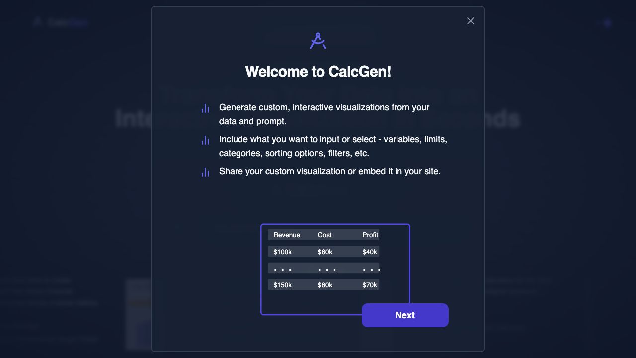 CalcGen AI is a platform designed to create interactive charts, graphs, calculators, and data visualizations effortlessly using AI. It allows users to generate custom visualizations from their data and prompts, including options to input variables, limits, categories, sorting options, and filters. Users can share or embed these visualizations on their websites. CalcGen AI supports various data inputs, enhancing data storytelling and insights for businesses and educators.
