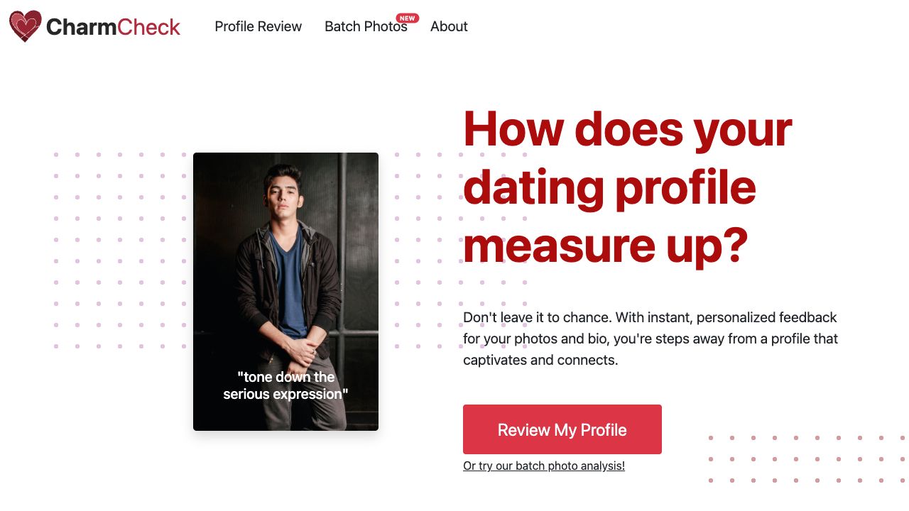 Users can review their dating profile by uploading photos and bio text to the Charm Check platform. The AI then provides instant, personalized feedback on aspects like photo quality, facial expressions, and bio content, offering suggestions for improvement.