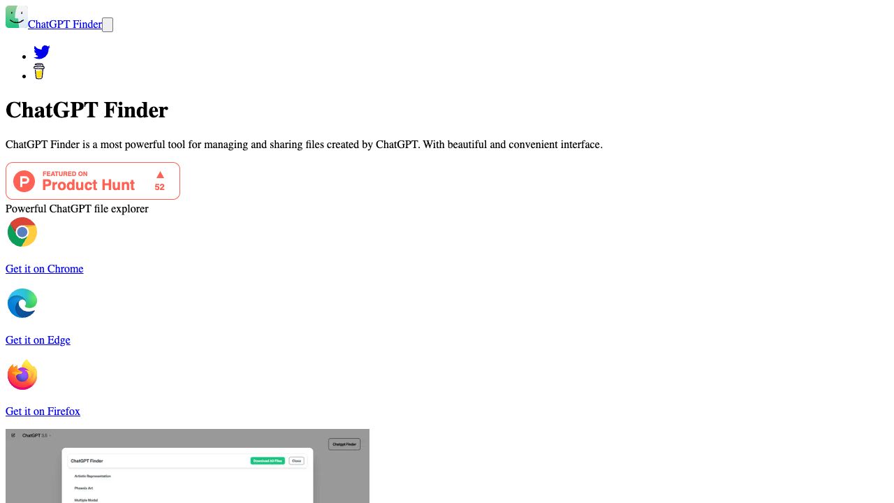 ChatGPT Finder is a browser extension designed to enhance the management and exploration of files created within ChatGPT. It is available for Chrome, Edge, and Firefox. The extension provides features such as previewing files, downloading DALL-E images, and downloading all files generated during ChatGPT conversations. It aims to provide a convenient and powerful interface for managing and sharing ChatGPT creations.
