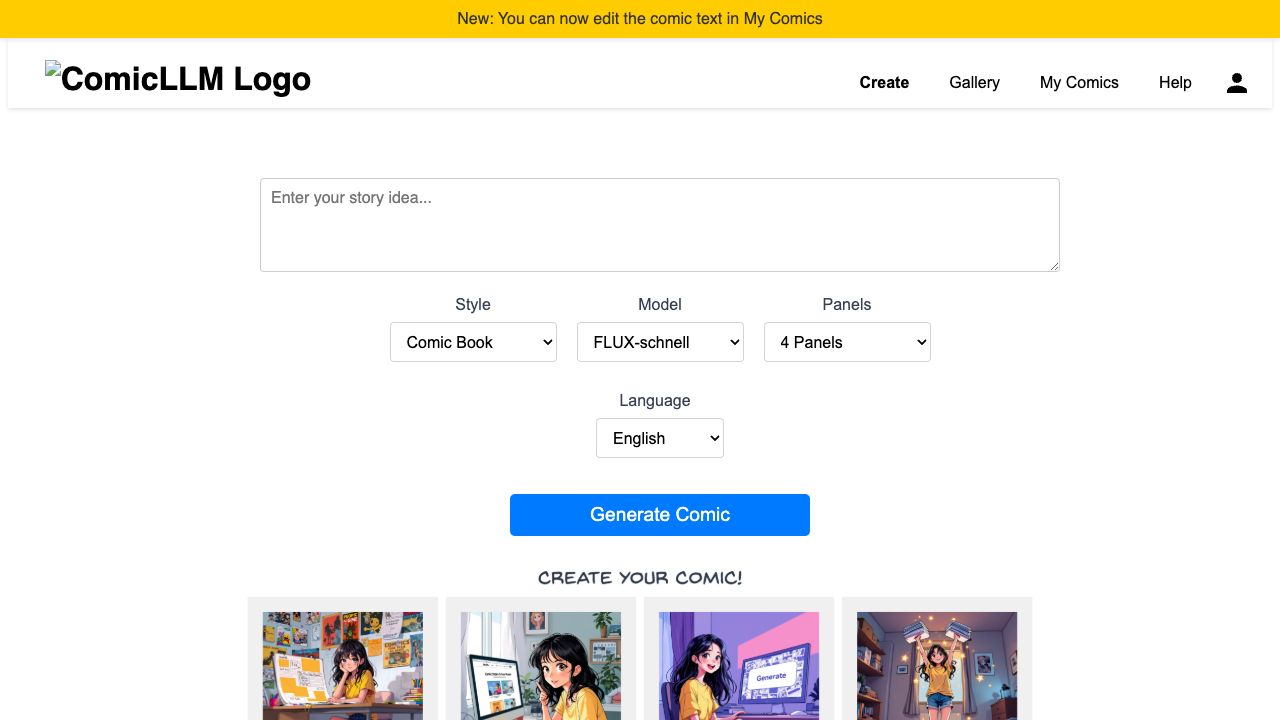 Comic LLM is an AI-powered tool that creates visual stories in various artistic styles. Users can submit an idea or even a news article, pick a style, and the number of panels, and the tool generates a comic.