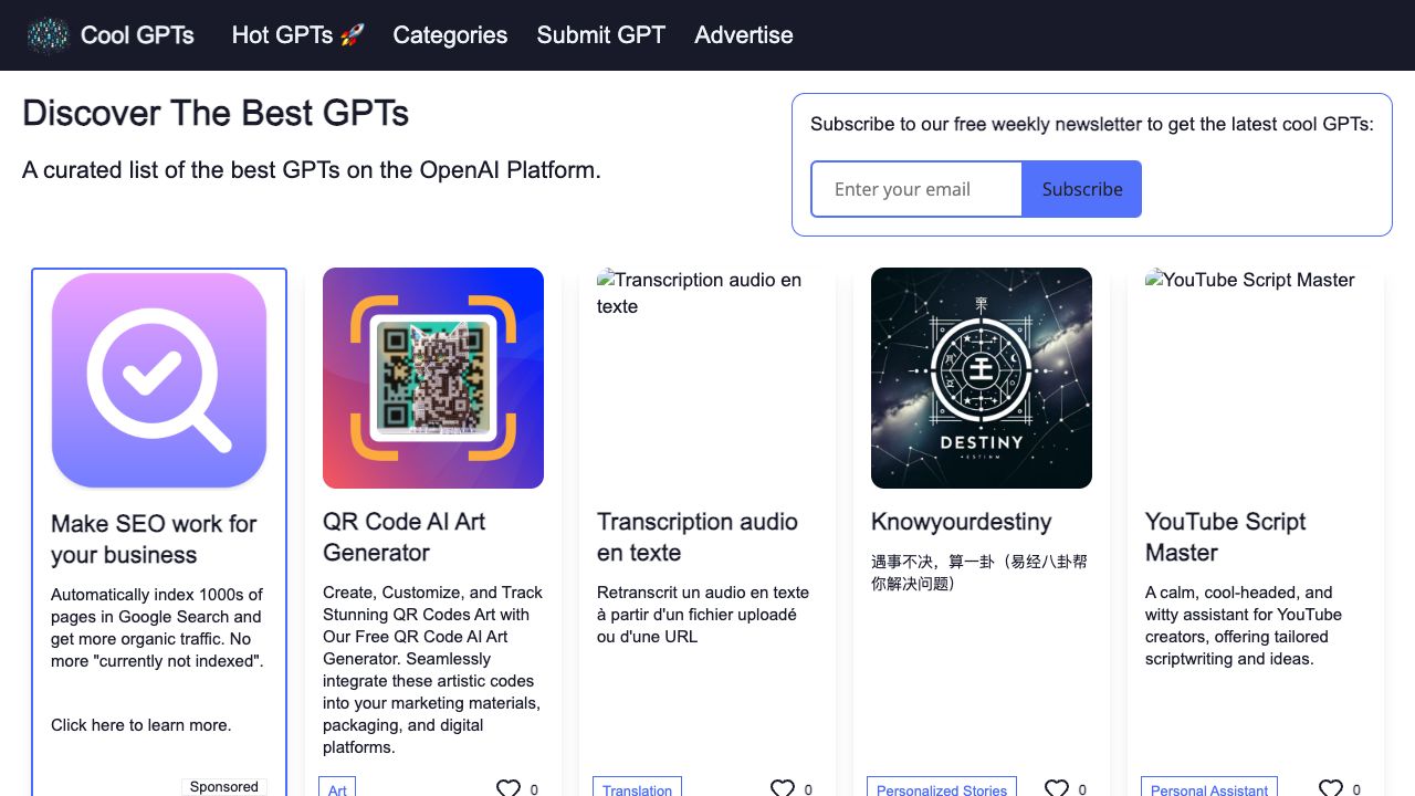 CoolGPTs is a catalog of the best GPTs (Generative Pre-trained Transformers) available on the OpenAI platform. It serves as a curated list to help users discover and access awesome GPTs for various purposes. The platform allows users to submit their own GPTs, advertise them, and explore different categories of GPTs.