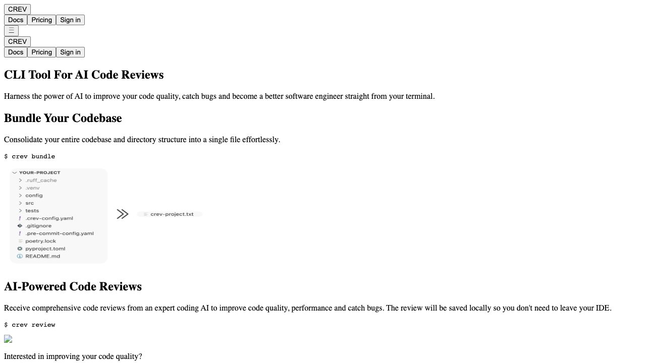 Use the Crev CLI tool to bundle your codebase and then run the review command to receive AI-powered code reviews directly in your terminal. The review will be saved locally.