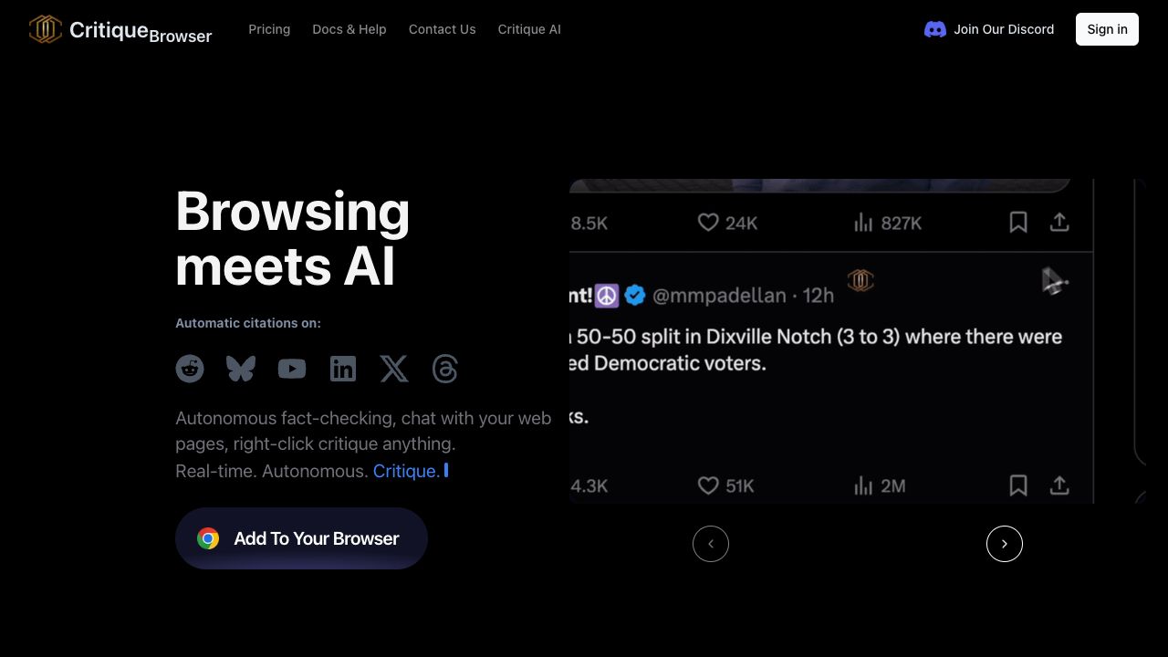 Critique is a modern information verification tool that automatically fact-checks content on major platforms like X, Reddit, YouTube, and LinkedIn. It allows users to 'critique' any text by asking questions or getting it vetted. Additionally, it provides automatic article breakdowns, including facts and reliability scores. Critique is available as a browser extension and aims to combat misinformation by providing real-time, autonomous fact-checking.