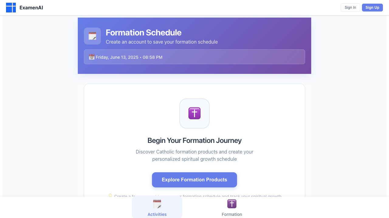 Explore the Sunday Gospel examination with ExamenAI, browse Catholic young adult events, and build faith formation apps using the no-code platform. Users can also access their spiritual practices and upcoming events in their personalized feed.