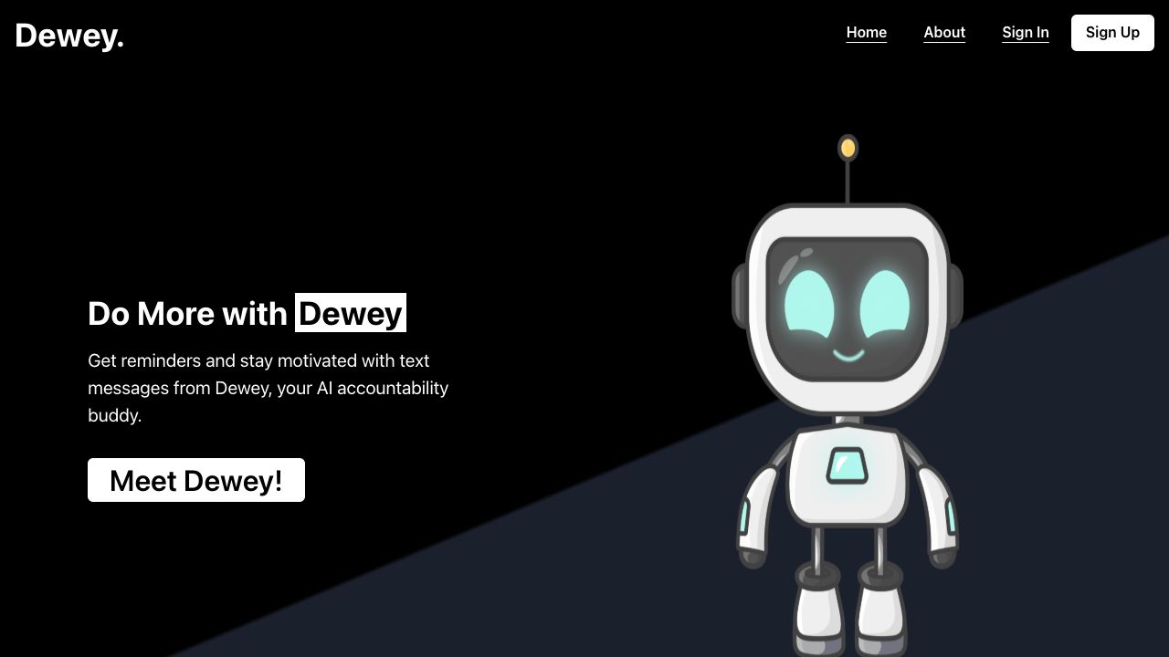 Our conversational AI accountability buddy and personal assistant uses SMS text messaging and GPT to keep you motivated and on track towards achieving your goals. With the help of our AI assistant, you'll have the support and accountability you need to stay focused and achieve success. Dewey: Your new accountability buddy Dewey: Your new accountability buddy