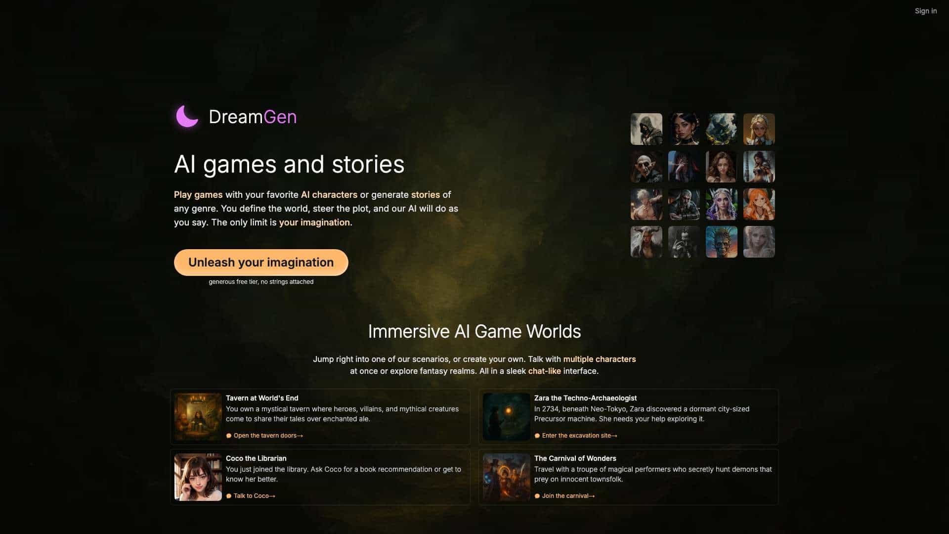 DreamGen is an AI role-play and story generator. It allows users to chat with AI characters, generate fan-fiction, and create stories of any genre. The platform emphasizes user imagination with no rules or restrictions, enabling the creation of complex worlds with rich lore and steerable narratives.