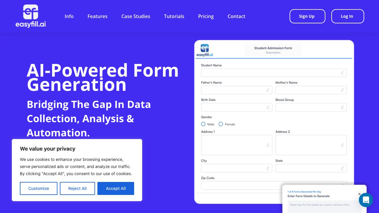 Use EasyFill.ai to create forms in seconds with AI, convert PDFs into fillable forms instantly, analyze submissions in real-time, and automate routine tasks.