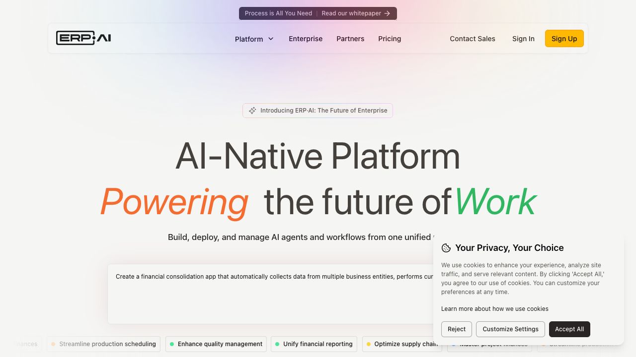ERP.AI transforms your ERP system into an intelligent powerhouse. Seamlessly integrated, it boosts data governance, decision-making, and workflow automation. From smart approvals to financial automation, ERP.AI helps you streamline operations and stay ahead. It adapts to the needs of a small business as well as a large enterprise, offering custom-built solutions and industry-specific operations.
