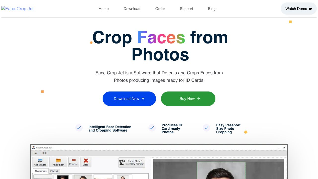 Face Crop Jet is a software designed to automatically detect and crop faces from photos, producing images ready for ID cards and passport photos. It offers intelligent face detection and cropping with zero configuration, supporting various image formats and sizes. The software can monitor folders and automatically crop faces, process photos in bulk, and allows users to set output sizes and crop shapes.