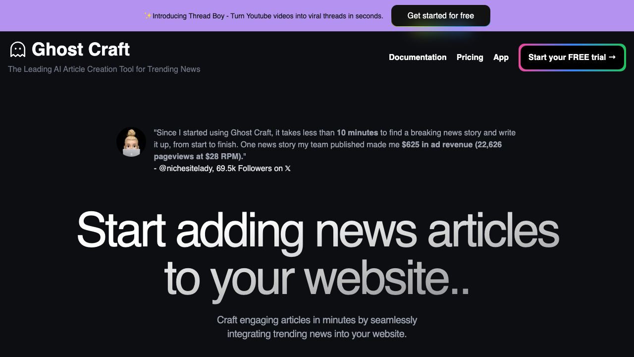 Ghost Craft AI is an AI-driven tool specializing in creating SEO-optimized blog posts and articles. It is trained on industry-leading content guidelines, ensuring high-quality, engaging content tailored per account. Each user's unique model adapts to their assigned brand. It seamlessly integrates trending news into websites, crafting engaging articles in minutes. Ghost Craft offers features like automated featured image generation, multiple language support, WordPress integration, and a robust outline editor.