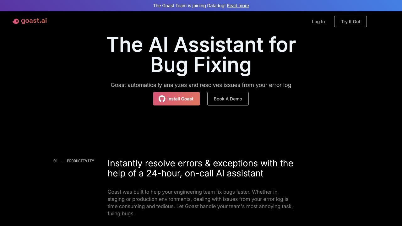 Goast.ai is an AI assistant designed to automatically analyze and resolve issues from error logs. It helps engineering teams fix bugs faster by providing real-time bug fixes, root cause analysis, step-by-step solution plans, and context-aware code generation. Goast integrates with popular error monitoring platforms and git providers to streamline the bug fixing process.
