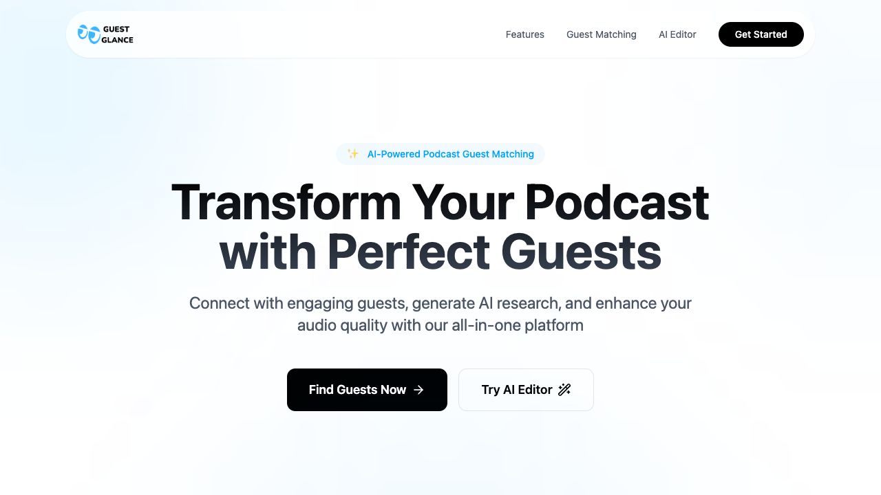 Guest Glance is an AI tool for podcasters to streamline guest research, edit audio/video, and integrate interviews into calendars. It also functions as an AI Guest and Host Matching Platform, helping podcasters connect with engaging guests, generate AI research, and enhance audio quality. Features include AI-powered guest matching, an AI editor, and tools for smart guest matching, AI research assistance, and AI audio enhancement.