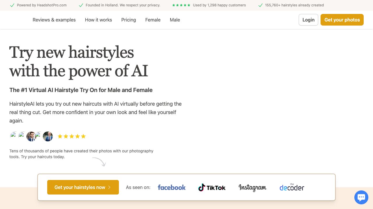 HairstyleAI is a virtual AI hairstyle try-on tool that allows users to generate and preview different hairstyles on their photos before getting a real haircut. It works for both male and female haircuts, providing 30 unique AI hairstyles and 120 HD photos for a one-time payment of $9.