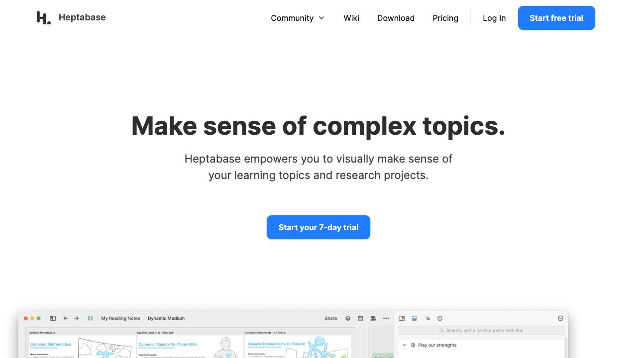 Heptabase is a note-taking tool designed for visual learning and knowledge management. It empowers users to visually make sense of complex topics and research projects through whiteboards, mindmaps, tables, and kanban boards. It supports various formats like PDFs, audio, video, and journals, all in one place, and facilitates collaboration with friends and teammates, offering real-time sync and offline access.