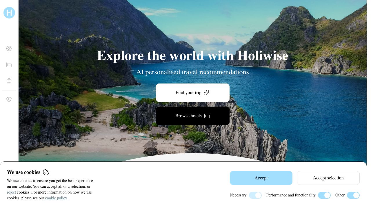 Holiwise is a travel platform that uses AI to provide personalized travel recommendations, including destinations, itineraries, and hotels. It allows users to explore destinations, book hotels with no hidden fees, and plan group trips. The platform also offers features like price comparison for hotels, refundable booking options, and tools for organizing group travel plans.