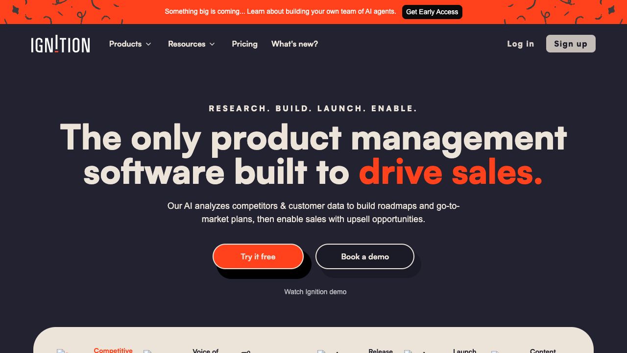 Ignition helps you research customers, gather competitive intel, create content, and launch products & campaigns. Start with a free plan and upgrade as needed. The platform integrates with existing tools for easy onboarding.