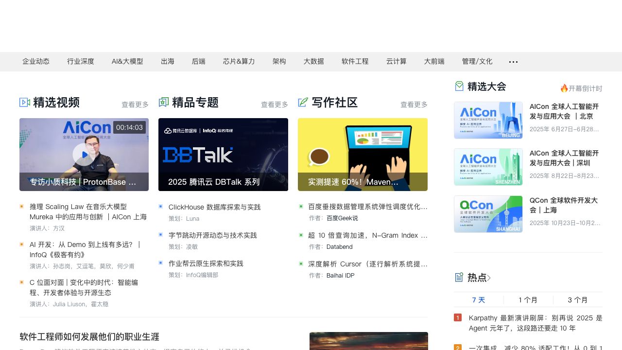 InfoQ是一个实践驱动、以社区为中心的技术媒体平台,致力于促进软件开发及相关领域知识与创新的传播,提供架构,云计算,AI,前端,大数据等与软件开发相关的最新技术资讯、解读及技术会议。