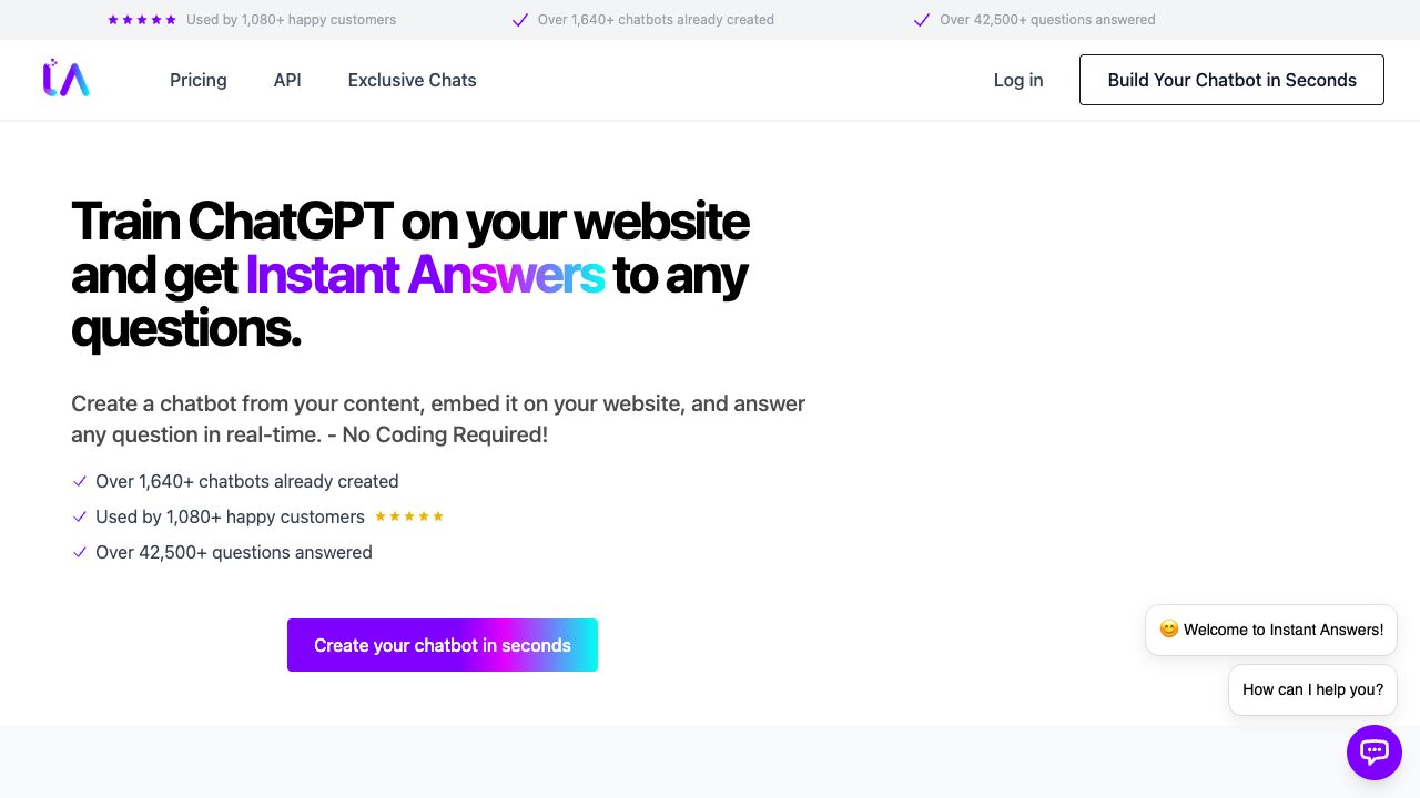 Instant Answers is an AI-powered chatbot builder that allows you to easily train and customize a chatbot using your own website or document data. Embed it on your site to provide real-time support, answering user queries instantly. No coding skills required. It improves customer experience and saves time by automating support with customizable chatbots and a searchable knowledge base.