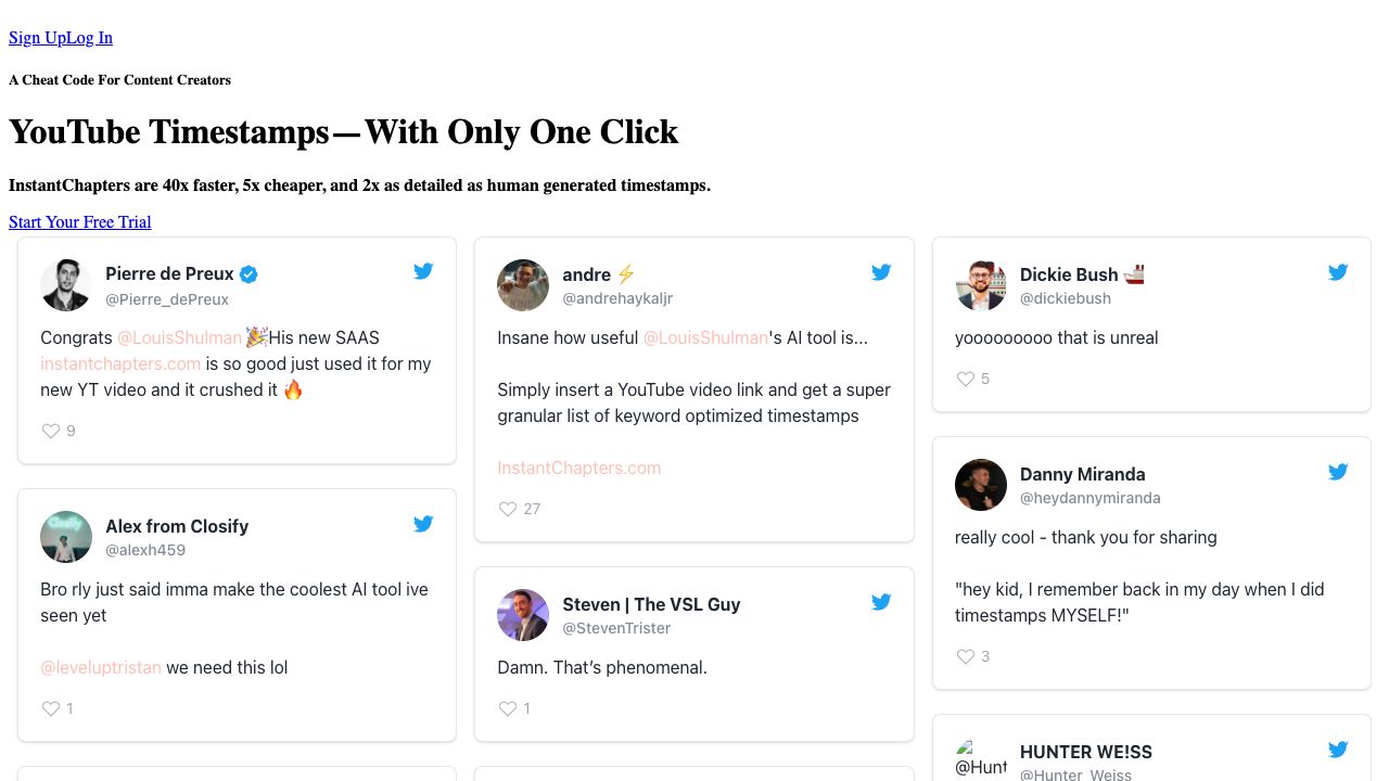 Instant Chapters uses AI to automatically generate high-quality timestamped chapters for YouTube Videos. High-quality chapters increase viewer engagement, retention, and improve SEO discoverability. It generates timestamped chapters 40x faster, 5x cheaper, and 2x as detailed as human-generated work. It empowers creators by streamlining their content organization, enhancing viewers' experience, boosting watch time, and fueling channel growth.