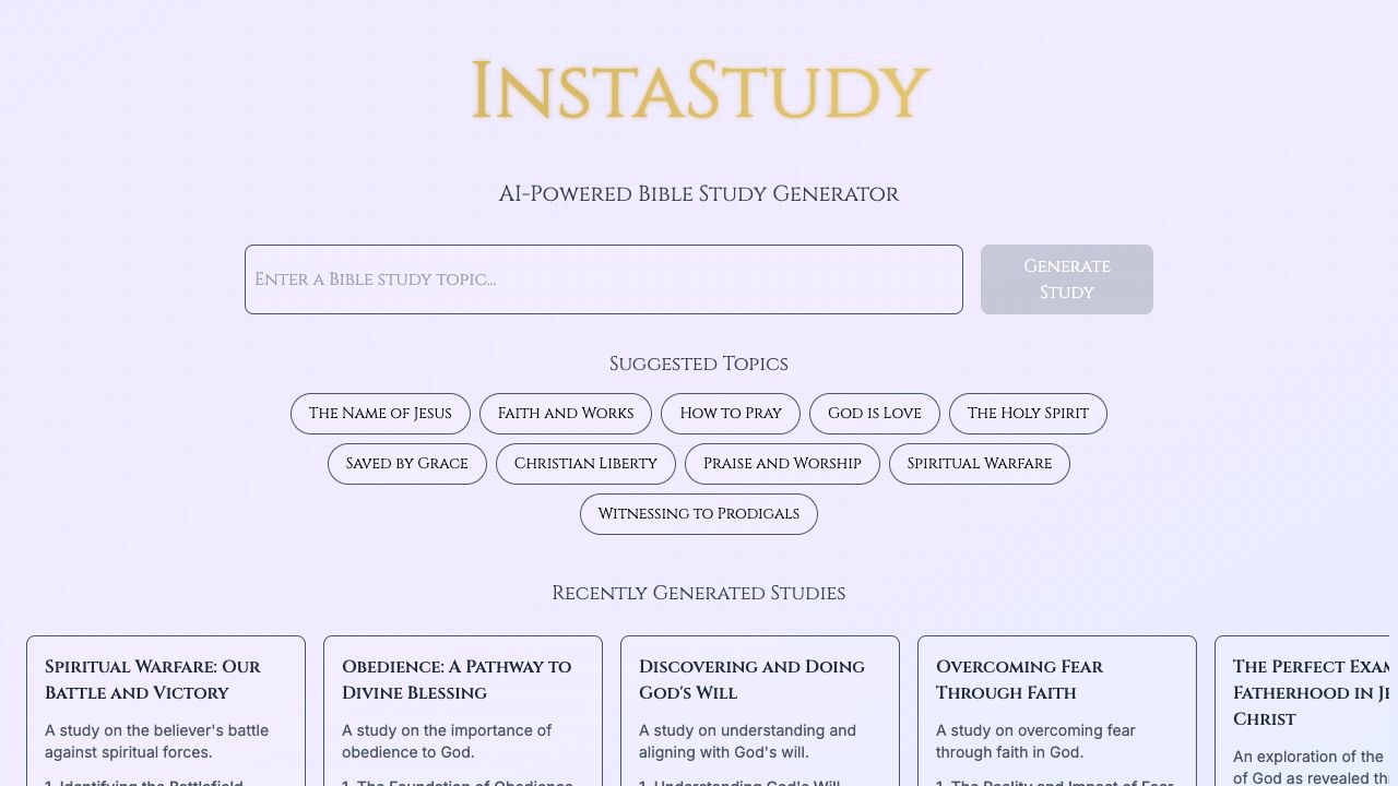 Use InstaStudy by selecting a suggested topic or generating a study. The AI will create a comprehensive Bible study outline with relevant scripture references and explanations.