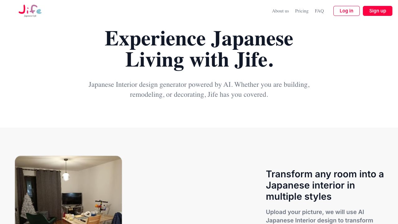 Jife is an AI-powered platform designed to help users experience Japanese living through interior design, cuisine, and fashion. It allows users to transform their living spaces into Japanese-style interiors by uploading pictures of their rooms and using AI to generate design options. Jife also offers recipes based on available ingredients and fashion advice inspired by Japanese style.