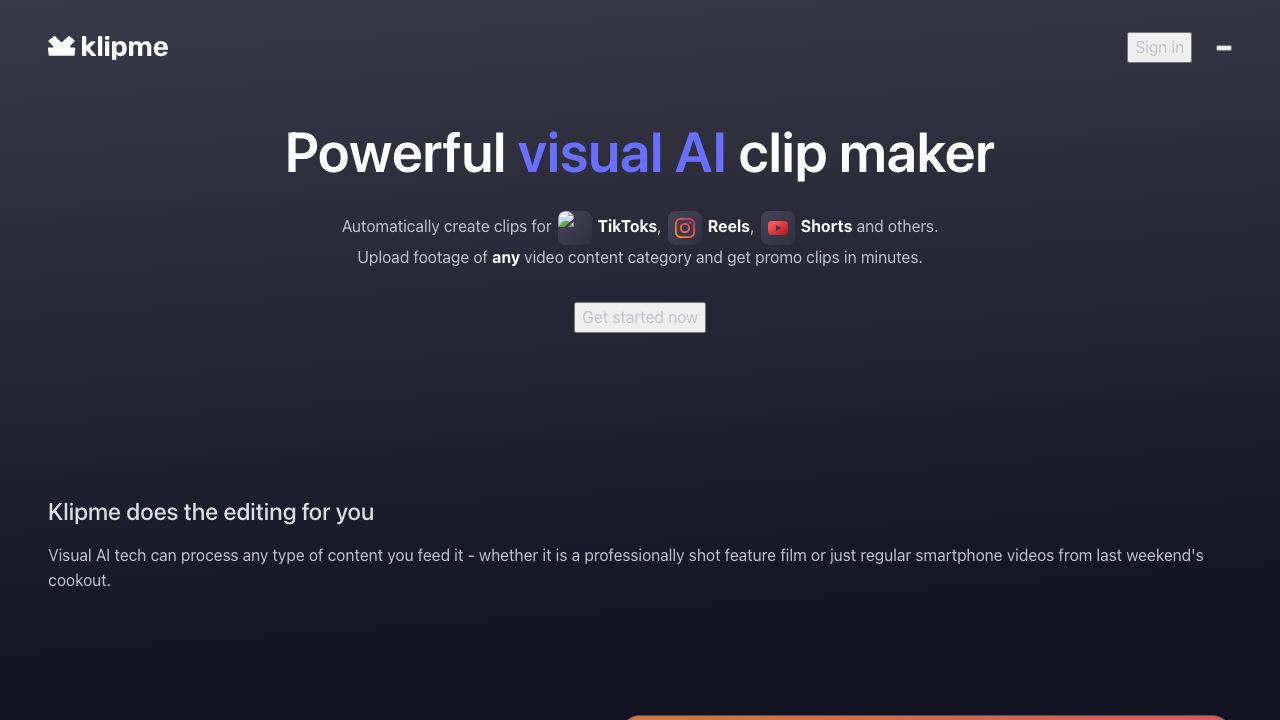 Klipme is an AI video editor designed to streamline the editing process. It uses AI to analyze longer videos and choose the best moments for creating promotional clips and summary reels. It helps users leverage their footage to up their promotion or social media game with AI-generated content.
