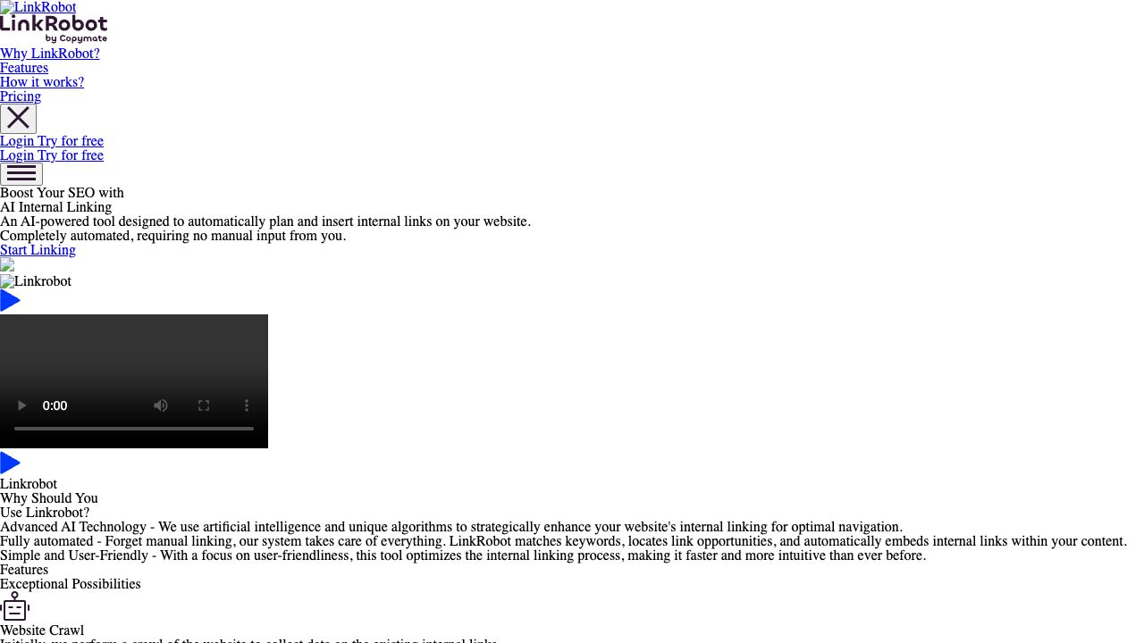 LinkRobot is an AI-powered tool designed to automatically plan and insert internal links on your website. It uses artificial intelligence and unique algorithms to strategically enhance your website's internal linking for optimal navigation. The tool is fully automated, matching keywords, locating link opportunities, and automatically embedding internal links within your content, requiring no manual input. LinkRobot also offers WordPress integration, allowing users to add all links automatically with a single click.