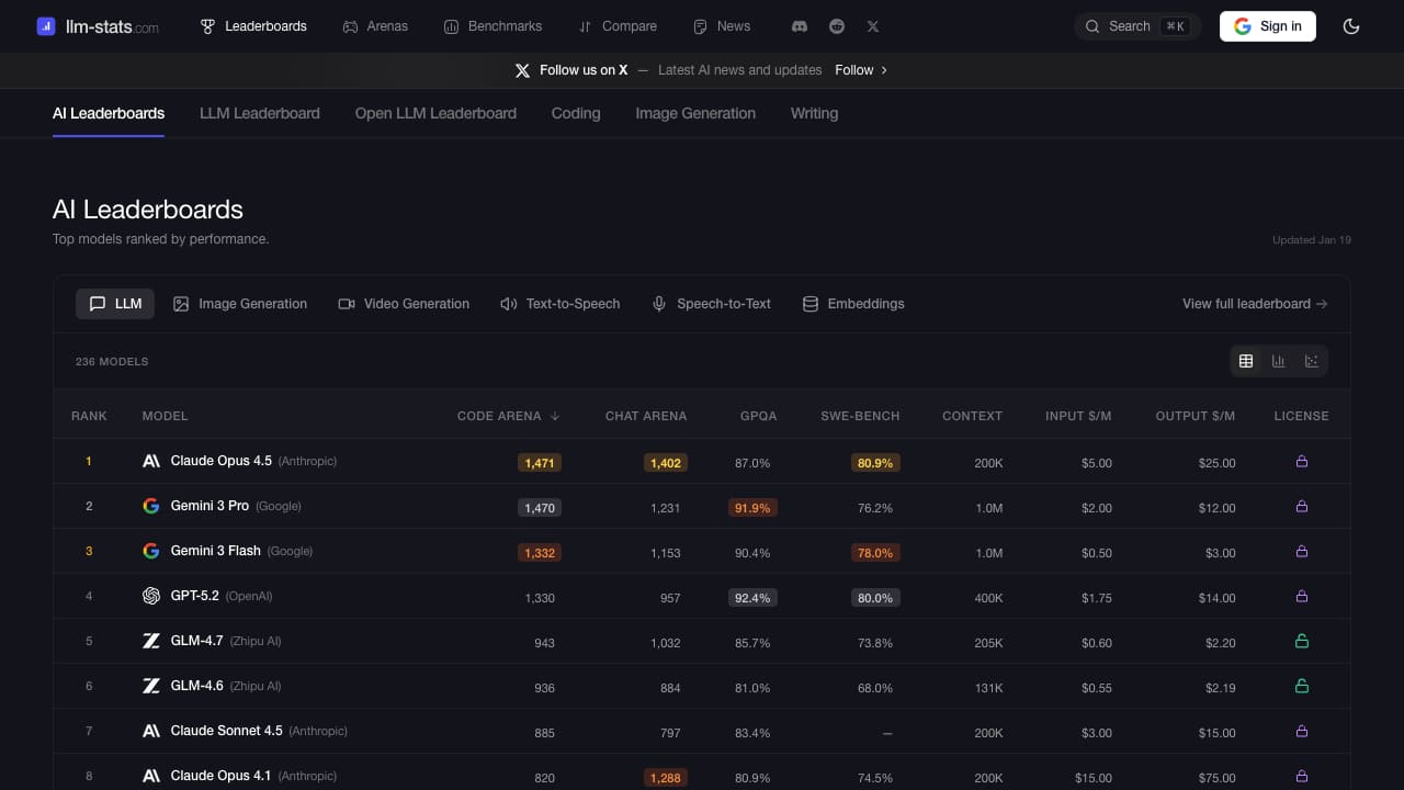 Comprehensive AI leaderboards comparing LLM, text-to-speech, speech-to-text, video generation, image generation, and embedding models. Compare performance, pricing, context windows, and benchmark scores across all AI modalities.