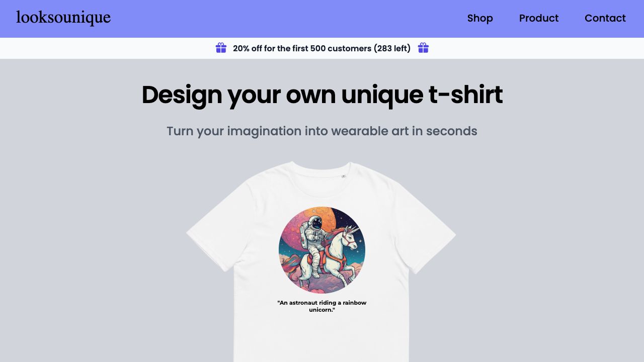 looksounique.com is a website that allows users to design their own unique t-shirts using AI. Users can input their design ideas, and the AI transforms these ideas into unique designs. They can then choose their preferred design, select a color and shape, and have the design printed on a premium cotton t-shirt, which is then shipped to their door.